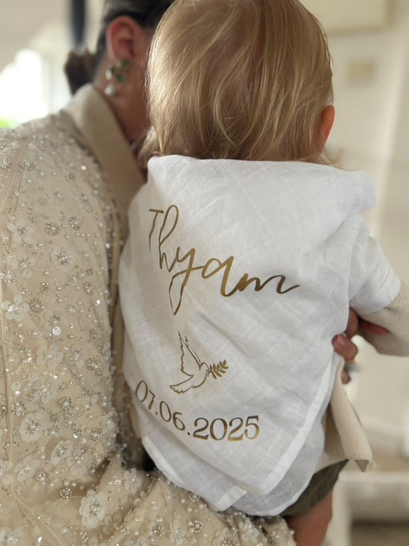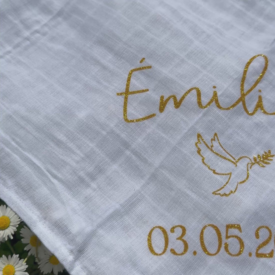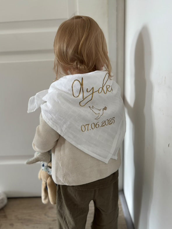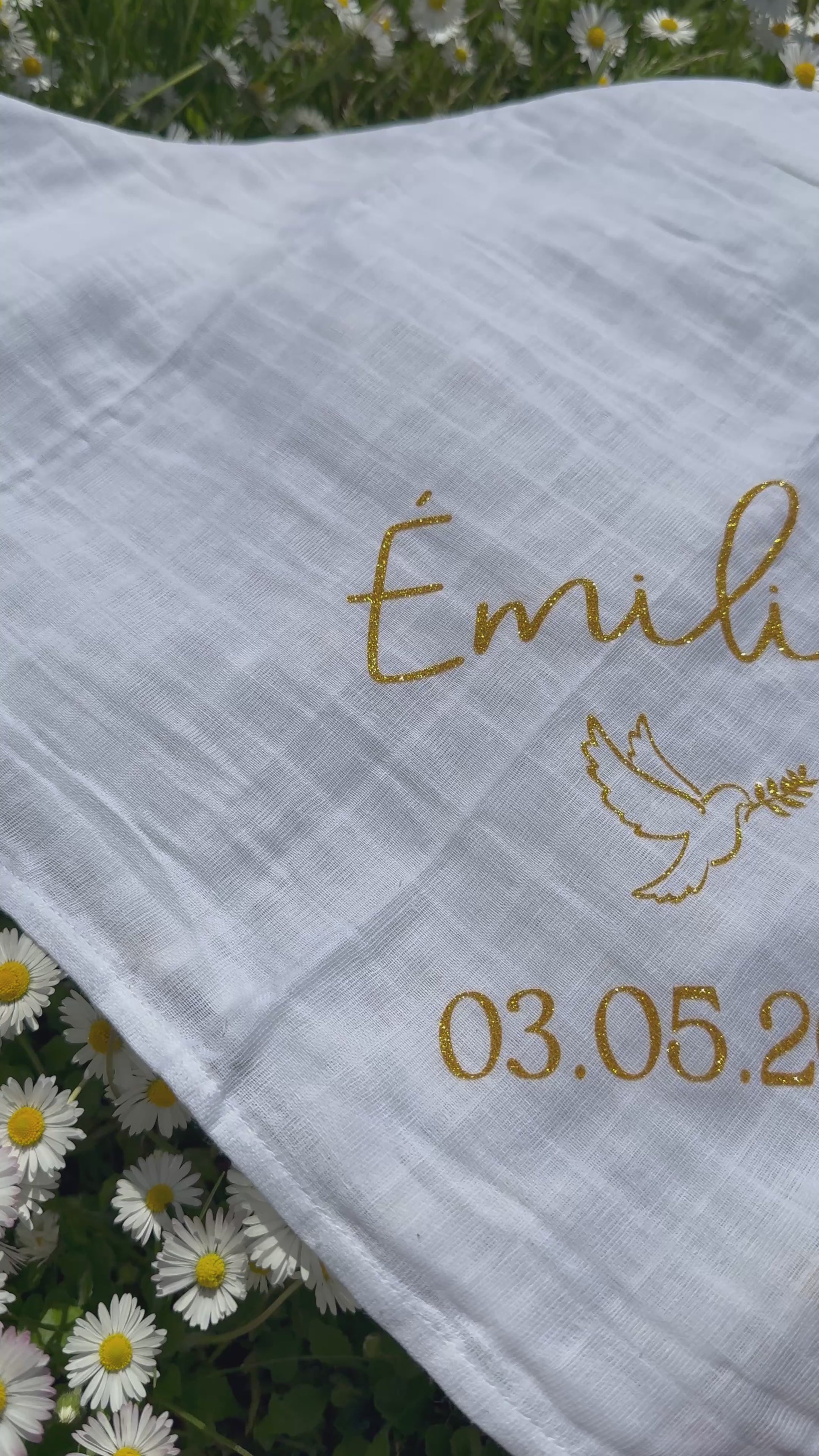 Offrez ou conservez un souvenir précieux du baptême avec ce lange personnalisé, à la fois tendre et symbolique. Conçu pour marquer ce moment unique, il accompagnera bébé avec douceur tout en célébrant l’amour et la foi.